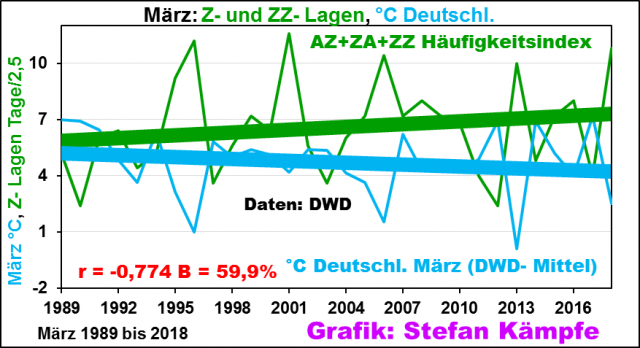 Abb. 9: Die Häufigkeitszunahme kalter Lagen bewirkte seit 1989 eine Märzabkühlung in Deutschland. Der Zusammenhang ist signifikant. Die 2019er Ergebnisse sind noch nicht ausgewertet.