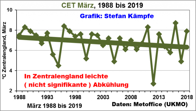 Kritiker mögen einwenden, der seit über 30 Jahren fallende deutsche Märztemperaturtrend sei ein Einzelfall. Doch auch in manchen anderen Regionen der Nordhalbkugel stehen, zumindest momentan, die Zeichen eher auf Märzabkühlung. Da die 2019-er Werte international noch nicht überall vorliegen, wird im Folgenden teilweise der Zeitraum 1988 bis 2018 betrachtet. Zuerst schauen wir nach Zentralengland: