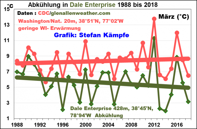 Washington, Abkühlung im ländlichen Dale Enterprise beim Monat März. An beiden Standorten sind im Betrachtungszeitraum die CO2-Konzentration gleich gestiegen. Somit zeigt auch diese Grafik, dass der menschenerzeugte Wärmeinselunterschied den wesentlichen anthropogenen Einfluss darstellt. Eine CO2-Wirkung ist nicht erkennbar.