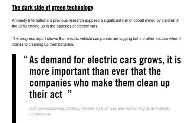 Obwohl Kalifornien und die USA [Bundesregierung] die Transparenz ihrer Supply Chain Gesetze [Lieferketten] gesetzlich verankert haben, beginnend mit Transparenz in Supply Chains Kalifornien Act SB657 und gefolgt von den USA mit HR4842 – Business -Supply – Chain – Transparenz auf Handel und Sklaverei Act von 2014, entschuldigen sich die reichsten und mächtigsten Unternehmen der Welt sich immer noch dafür, ihre Lieferketten nicht untersucht zu haben, und ihre produzierten Elektrofahrzeuge werden weiterhin mit „schmutzigen Batterien“ betrieben.