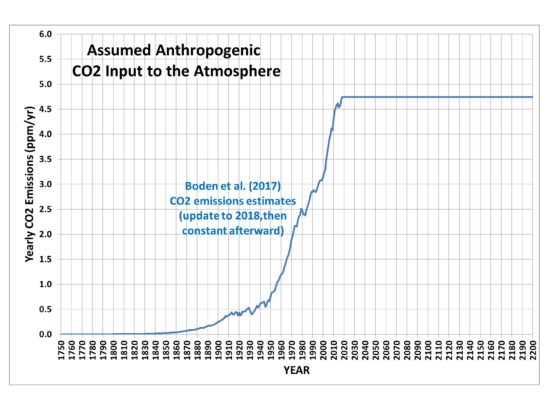Das Modell verwendet die Schätzungen der jährlichen anthropogenen CO2-Erzeugungsraten seit 1750 von Boden et al. (2017), aktualisiert bis 2018. Das Modell geht davon aus, dass die Rate, mit der CO2 aus der Atmosphäre entfernt wird, proportional ist zum atmosphärischen Überschuss über einem bestimmten natürlichen „Gleichgewichts-Niveau“ der CO2-Konzentration. Eine Tabellen-Kalkulation mit dem Modell findet sich hier.