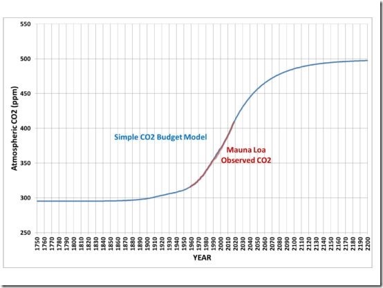 Man beachte, dass sich interessanterweise die atmosphärische Konzentration trotz fortgesetzter CO2-Emissionen bei nahe 500 ppm stabilisiert. Dies ist die direkte Folge der Tatsache, dass die Mauna Loa-Messungen die Vermutung stützen, dass die Rate, mit welcher CO2 aus der Atmosphäre entfernt wird, direkt proportional ist zu der Menge des „Überschuss“- CO2 in der Atmosphäre über einem „natürlichen Gleichgewichts“-Niveau. Mit der Zunahme des CO2-Gehaltes nimmt auch die Rate oder Entfernung zu, bis sie zur Rate des anthropogenen Eintrags passt.
