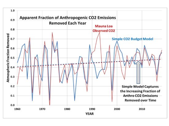 Wir können auch die Entfernungsrate von CO2 als einen Anteil der anthropogenen Quelle untersuchen. Wir wissen schon lange, dass nur die Hälfte dessen, was emittiert wird, in der Atmosphäre „auftaucht“ (was nicht das ist, was wirklich vor sich geht), und vor Jahrzehnten hat das IPCC vermutet, dass Biosphäre und Ozeane nicht das Überschuss-CO2 mit einer derartig hohen Rate entfernen können. Aber tatsächlich ist es so, dass der Bruchteil der Rate der Entfernung zugenommen und nicht abgenommen hat. Und das einfache Modell bildet dies ab: