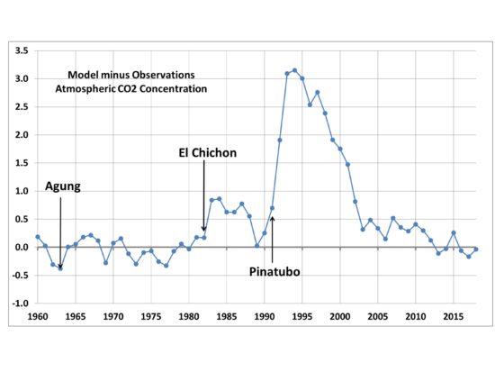Und zum Schluss eine Graphik, welche die Differenz zeigt zwischen dem Modell und den Mauna Loa-Messungen. Dabei werden die Auswirkungen von Vulkanen sichtbar. Nach einem großen Ausbruch wird die CO2-Menge in der Atmosphäre gedrückt, entweder durch eine Abnahme der natürlichen Emissionen von der Oberfläche oder durch eine Zunahme des atmosphärischen Aufnehmens von CO2 der Atmosphäre: