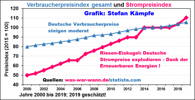 „Es bleibt dabei, dass die Förderung erneuerbarer Energien einen durchschnittlichen Haushalt nur rund einen Euro im Monat kostet – so viel wie eine Kugel Eis.“ Das hatte uns der grüne Oberlehrer Jürgen Trittin im Jahre 2004 versprochen (Quelle: wikiquote.org). Vielleicht meinte er ja Eiskugeln von der Größe eines Medizinballes oder gar der eines Heißluftballons – die Realität sieht ganz anders aus. Es melde sich derjenige Haushalt, welcher 15 Jahre danach bei gleichbleibendem Verbrauch nur 12 Euro mehr für seine jährliche Stromrechnung bezahlen muss! Wer ein Haushaltsbuch führt, kann die Aussage der folgenden Grafik bestätigen – Strom verteuerte sich viel stärker, als die Verbraucherpreise insgesamt; für einen Normalhaushalt kommen da schnell ein paar hundert Euro mehr im Jahr für den teureren Strom zusammen. Herr Trittin müsste eigentlich Bauchschmerzen von den zahlreichen Eiskugeln bekommen: