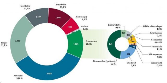 Abbildung 3: Selbst 30 Jahre nach Beginn der Energiewende fangen die „Erneuerbaren“ weit weniger als ein Fünftel des Primärenergieverbrauches auf (der grüne Sektor auf der rechten Seite des großen Kreises). Bildquelle: Bundesministerium für Wirtschaft und Energie.