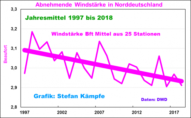 Abbildung 6: Windabnahme in Norddeutschland seit über 20 Jahren. Weil ein Flächenmittel fehlte, wurde dieses Mittel aus 25 norddeutschen DWD-Stationen berechnet.