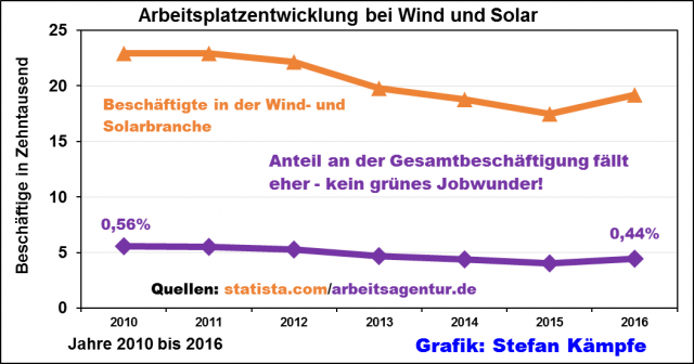 Ein zentrales, grünes Argument pro Energiewende war und ist die Schaffung von Arbeitsplätzen. Doch Politiker schaffen, von den meist ineffizienten Jobs in der Verwaltung, dem öffentlichen Dienst und der Bürokratie einmal abgesehen, direkt keine Arbeitsplätze; das kann nur die viel effektivere Privatwirtschaft. Freilich bestimmen politische Entscheidungen das Investitionsklima mit. Doch die jüngsten Pleiten vieler Betriebe der angeblich so grünen Technologien wie die von PROKON oder SOLARWORLD, aber auch zahlreicher Produzenten von Holzhackschnitzeln oder Bio-Kraftstoffen, konnten selbst durch noch so üppige Fördermittel und weitere günstige politische Rahmenbedingungen nicht verhindert werden. Die beiden wichtigsten „erneuerbaren“ Energieträger sind Wind und Sonne. Bis zum Jahre 2010 nahm die Beschäftigtenzahl dieser beiden Branchen stetig zu und erreichte mit etwa 229.000 Beschäftigten ihren Höchststand. Das hört sich gewaltig an; entspricht aber nicht einmal ganzen 0,6% der Gesamtbeschäftigtenzahlen Deutschlands. Danach führte die Pleitewelle in der Solarbranche zu einem merklichen Rückgang. Aktuell erholen sich die Zahlen zwar wieder geringfügig, aber von einem „Jobwunder“ sind sie etwa so weit entfernt wie der Fußballclub Schalke 04 vom Gewinn der Deutschen Meisterschaft, zumal die Gesamtbeschäftigung anstieg:
