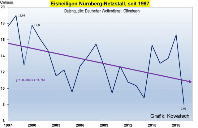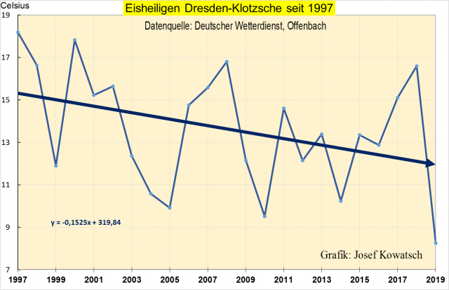 Nach vielen Falschmeldungen der Medien in den letzten Jahren über „Eisheiligen werden zu Heißheiligen“ erwarten wir vom DWD Vorstand Friedrich folgende Eisheiligenpressemitteilungen: „ Der Monat Mai wird in der Gegenwart kälter, aber die Eisheiligen werden noch kälter.“ Und als Ergänzung: „Die Eisheiligen werden in der freien Fläche Deutschlands bald wieder so kalt sein wie zur kleinen Eiszeit. Die starke Abkühlung der Eisheiligen in der Gegenwart konnte auch durch die Zunahme der CO2-Konzentration nicht aufgehalten werden.“