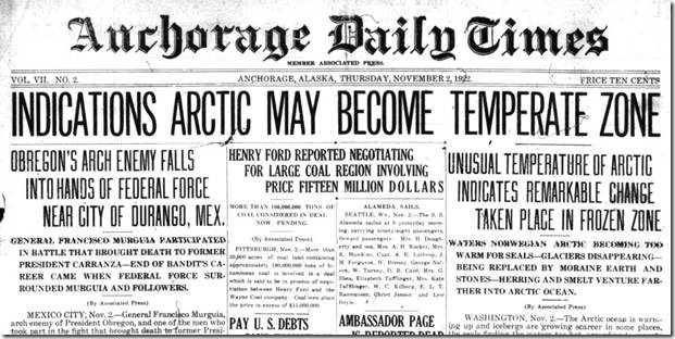 Seit vielen hundert Jahren korrespondiert schmelzendes arktisches Meereis mit beobachteten Perioden gesteigerten Eindringens von warmem atlantischen Wasser (hier). Die dramatische Erwärmung der Arktis während der 1920er und 1930er Jahre korrespondierte mit gesteigertem Eindringen warmem Wassers, begleitet mit dem Vordringen atlantischer Fisch-Spezies, die man normalerweise erst weiter südlich findet. Wie der Zeitungsausschnitt oben zeigt, war die Erwärmung der Arktis seinerzeit so dramatisch, dass Bedenken aufkamen, ob die Arktis demnächst zu einer „gemäßigten Zone“ [temperate zone] wird.