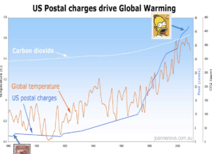 Nun bin ich ehrlichen Wissenschaftlern gegenüber sehr feinfühlig, die nicht auf den Zug aufspringen nur um einer weiteren Agenda willen. Sie konzentrieren sich auf CO2 und den Aufwärtstrend der Temperatur und glauben, dass die Korrelation Kausalität ist. Um zu demonstrieren, wie sehr man dabei in die Irre geführt werden kann, betrachten wir einmal die Korrelation zwischen einer Zunahme des Birefportos und der globalen Temperatur (am Ende dieser Graphik steht die Homer Simpson-Briefmarke):