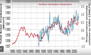 Man erkennt, falls man argumentiert, dass CO2 die Ursache ist, dann kann man genauso gut argumentieren, dass die Zunahme des Briefportos (fälschlich) ebenfalls die Ursache ist. Ja, das ist absurd, aber es unterstreicht den Punkt, dass Korrelation nicht Kausalität ist. Falls wir beispielsweise auf die solare Gesamt-Einstrahlung und die Temperatur schauen, scheint das eine viel bessere Verbindung zu sein:
