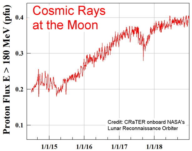 Mit dem fortschreitenden Jahr 2019 sieht es so aus, als würde sich das solare Minimum immer mehr vertiefen. Kosmische Strahlung haben zwar noch nicht den Rekord des Raumfahrt-Zeitalters 2009-2010 gebrochen, liegt aber nur noch wenige Prozentpunkte unter den höchsten, jemals von CraTER gemessenen Werten.