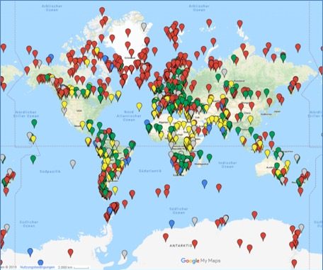 Zur Erläuterung: HadCrut4 teilt die Erde in Zellen von je fünf Längen- und Breitgraden Ausdehnung ein. Die Idee ist, für jede dieser Zellen mindestens eine verlässliche Messung zu haben, um die Gesamttemperatur der Erde dann aus der Kombination aller Zellen errechnen zu können. Die Wirklichkeit ist: Viele der Zellen sind schlicht leer, ein Problem, das auch „Raphael Neukom und sein Team“ nicht gelöst haben, wie die folgende Abbildung zeigt: