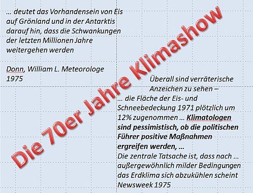 Da kann ich auch noch etwas beisteuern. In dem Buch von Nigel Calder „Die Wettermaschine. Droht eine neue Eiszeit?“ (1977) steht wörtlich:“Jüngsten Erkenntnissen der Klimaforschung zufolge nimmt die Wahrscheinlichkeit zu, daß noch zu unseren Lebzeiten eine neue Eiszeit einsetzt.“ Irgendwo im Text steht sogar, dass sich die Klimawissenschaftler einig sind.