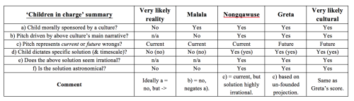 In dem Artikel Child Soldiers in the Culture Wars [etwa: Kindersoldaten im Kulturkrieg] heißt es: Die von politisch aktiven Kindern repräsentierten Wertvorstellungen sind offensichtlich. Sensible Themen, die bei leidenschaftsloser Behandlung verkümmern, blühen auf, wenn diese Art der Analyse tabu ist. Hinzu kommt der emotionale Einfluss des Umstandes, dass Kinder mit ihrem Unschuldsanspruch besondere Einsichten/Wahrheiten haben, was die Überzeugungskraft dieser Mädchen mächtig verstärkt. (Trotz der Tatsache, dass dieser Umstand falsch ist und auch irrelevant bzgl. persönlicher Aspekte ist wie Gretas Asperger-Syndrom). Diese Faktoren erzeugen eine emotionale Nebelwand, welche die Irrationalität unserer Empfindungen verstärken kann. Um wie in Abschnitt 1 beschrieben herauszufinden, ob Realität oder Kultur die Auftritte dieser beiden Mädchen vor den Führern der Welt dominieren hinsichtlich grundlegender und komplexer sozialer Zusammenhänge, müssen ein paar Fragen gestellt werden: