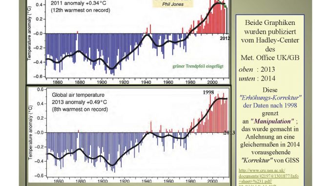 Er lässt sich begründen, denn in den letzten Jahren flogen immer wieder Skandale auf. So sorgten die australischen Meteorologen bei einer Temperaturreihe mit ihren «Anpassungen» dafür, dass statt einer Abkühlung von 1 Grad pro Jahrhundert eine Erwärmung von 2,3 Grad herauskam. Und so feierte das Nasa-Institut GISS 2014 globale Rekordwerte, weil es unter anderem den Trend der Messwerte von abgelegenen Messstationen in Lateinamerika gedreht hatte. Der britische Wissenschaftsjournalist Christopher Booker hält das Manipulieren der Temperaturdaten deshalb für «the biggest science scandal ever» (den grössten je erlebten Wissenschaftsskandal).
