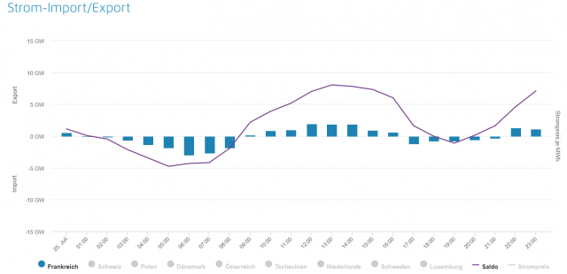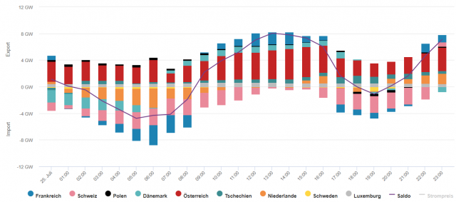 Bild 2 Strom Import/Export Deutschland gesamt am 25.07.2019. Größter-Abnehmer ist Österreich mit einem Angebot um 13 h von 8,044 GW