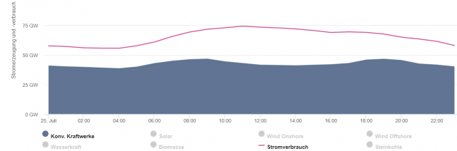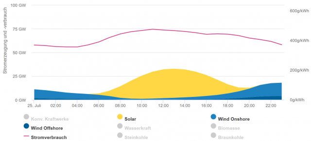 Die angeblich so rettungsfreudige Ökoenergie von Deutschland hat sich am gleichen Tag von 32,73 auf 5,2 GW Leistungsangebot reduziert, oder positiv ausgedrückt, um diese Angebotsdifferenz erhöht. Nicht planbar und stark Wetter-zufällig, aber immerhin. Das sind minus 84 % Differenz innerhalb weniger Stunden. Und das nicht nur während einer Hitzeperiode, sondern täglich und rund übers Jahr. Die Differenz kann selbstverständlich auch geringer werden: Wenn mittags wenig Sonne scheint und dadurch das tägliche Nacht-Minimum einen höheren Anteil „gewinnt“ und gut: Der Wind weht manchmal auch bei uns etwas stärker. Dürfen die Nord-Süd-Trassen gegen alle Bürgerproteste doch noch im Ansatz wie erforderlich gebaut werden, verteilt sich die Windenergie sogar etwas.