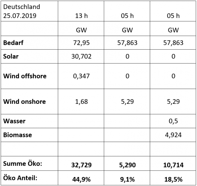 Gegen 13 h betrug der Eigenbedarf Deutschlands 72,95 GW. Das Ökoenergie-Leistungsangebot betrug kurzzeitig ca. 32,73 GW, also 45 % davon.