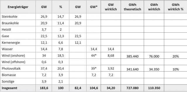 Nun die Energiezukunft Deutschlands gestreift. Die folgende Tabelle listet mit teils etwas veralteten – zur Veranschaulichung aber immer noch geeigneten – Werten Deutschlands Erzeugungsdaten.