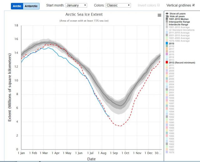 Aktuelle Eisbedeckung, hier die Darstellung vom National Snow & Ice Data Center , wer es lieber aus Deutschland mag, hier die oft genutzte Kurvendarstellung von der Universität Bremen