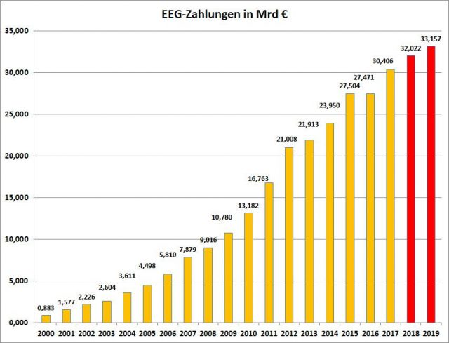 Bild 3. Kumulierte jährliche EEG-Auszahlungen an die Anlagenbetreiber seit 2000 (Zahlen für 2018 und 2019 beruhen auf amtlichen Prognosen) (Grafik: Autor, Datenquelle)