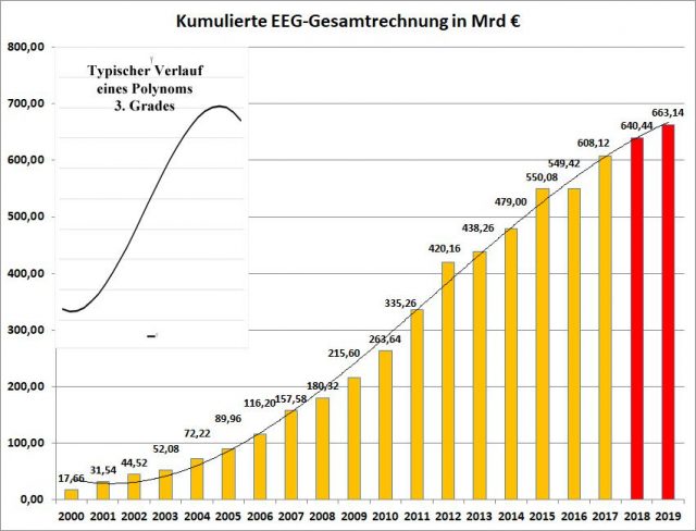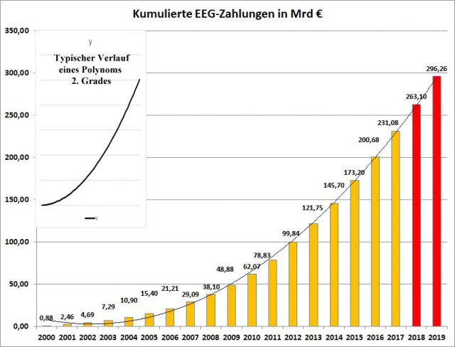 Zur Verdeutlichung wurde der Grafik eine Trendlinie hinzugefügt, die auf einem Polynom 2. Grades (typischer Verlauf siehe kleines Teilbild) beruht. Wie man sieht, bildet diese Trendlinie für die Jahre seit 2002 den Verlauf der Kostenentwicklung erstaunlich gut ab. Für jeden mit kaufmännischem Verstand ist eine solche Kurvenform ein Alarmsignal erster Ordnung, denn es charakterisiert eine „runaway cost“-Situation, d.h. eine Entwicklung, die außer Kontrolle geraten ist und immer schneller auf eine Katastrophe zusteuert. Solche Kurven sind typisch für betrügerische „Schneeballsysteme“ bzw. die aus den USA bekannten „Ponzi-schemes“ bei Investmentbetrugsfällen. Die Bundesregierung scheint jedoch entschlossen, diesen für Deutschland fatalen Kurs sogar noch erheblich zu beschleunigen. Dabei sind wir selbst mit den Zahlen von Bild 3 von der Wahrheit noch sehr weit entfernt.
