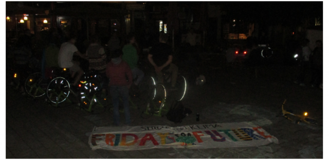 Begleitend zu dem symbolpolitischen und damit auf die Natur und das Klima völlig wirkungslosen Beschlüssen streikten Jenaer Schüler*innen und Studier*innen auf dem zentral gelegenen Holzmarkt von 11:45 bis um Mitternacht. Ich bin zwei mal vorbeigegangen und habe mir angeschaut, was die Kinners so machen. Es gab einen kleinen Pavillon mit Speisen aus der Dose und eine Gruppe von etwa 20 Personen u25, die auf dem Steinboden in der Sonne saß. Abends um neun waren die meisten immer noch da und strampelten auf Fahrrädern, die in ein Gestell mit Dynamotor eingespannt waren und luden damit einen Auto-Bleiakku auf, der einen Beamer und die Beleuchtung speiste.