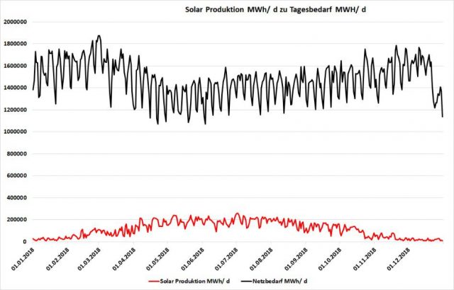 Bild 5. Gegenüberstellung der Tagesproduktion an Solarstrom zum jeweiligen Tagesbedarf in MWh/ d (Grafik und Berechnungen: Autor, Daten)