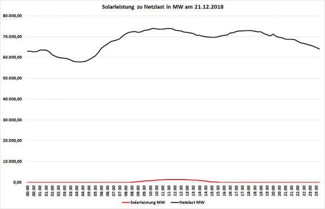 Bild 6. Der Beitrag der solaren Stromerzeugung zur Netzlast von 73.205 MW lag am 21.12.1018 selbst in der Spitze zur Mittagszeit bei geradezu kläglichen 1.414 MW (Grafik und Berechnungen: Autor, Daten)