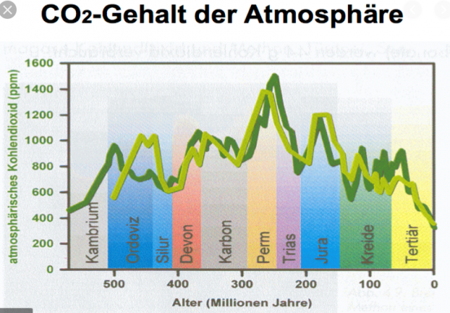 Bild 12 CO2-Gehalt der Atmosphäre zu den Zeiten der Kohleentstehung (Perm und Trias). Quelle: unbekannt