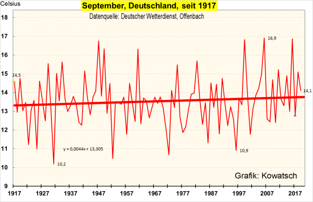 Der DWD weist für diesen Zeitraum einen linearen Trend von + 1,1 K aus. Die Abweichungen zu Kowatschs deutlich flacherem Trend liegen scheinbar darin begründet, dass vor 1920 die September überwiegend relativ kalt waren.
