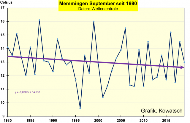Diese Richtlinien sind sehr allgemein und können nicht jede mögliche Situation abdecken. Nehmen Sie deshalb bitte nicht an, dass das EIKE Management mit Ihnen übereinstimmt oder sonst Ihre Anmerkungen gutheißt. Wir behalten uns jederzeit das Recht vor, Anmerkungen zu filtern oder zu löschen oder zu bestreiten und dies ganz allein nach unserem Gutdünken. Wenn Sie finden, dass Ihre Anmerkung unpassend gefiltert wurde, schicken Sie uns bitte eine Mail über "Über Uns->Kontakt"Zitat: „Bei den in diesem Bericht ausgewählten sechs wärmeinselarmen Stationen der Grafiken 4 bis 9 kann man leicht erkennen, dass seit 2005 die Septembertemperaturen alle leicht gefallen sind.“