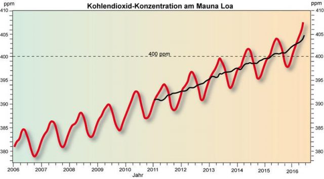Starke CO2-Zunahme: Laut Wikipedia haben aber just in diesem Zeitraum die CO2-Konzentrationen weltweit stark zugenommen. Bereits 2016 soll die 400 ppm-Konzentration der Atmosphäre = 0,04% überschritten worden sein und nächstes Jahr soll die Konzentration auf 410 ppm steigen.