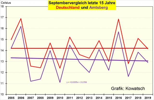 Grafik 12: Die letzten 15 Septembermonate, DWD-Deutschland (Rot) der Schnitt aus über 1800 Stationen zeigt eine ebene Trendlinie, die ländliche wärmeinselarme Station Amtsberg eine leicht fallende.