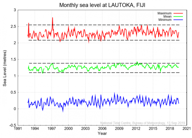 [7] … Es stellte sich heraus, dass der Meeresspiegel bei den Fidschi-Inseln während der letzten 200 Jahre praktisch stabil geblieben ist. Allerdings wurden zwei geringe Änderungen beobachtet. Der Meeresspiegel schien Anfang des 19. Jahrhunderts um etwa 30 cm höher gelegen zu haben. Kurz nach dem Jahr 1950 fiel der Meeresspiegel um etwa 10 cm, was zum Absterben vieler Korallen führte, die bis zu ihrem Minimum-Niveau von 40 cm unter der Wasseroberfläche gewachsen waren. Während der restlichen 50 bis 70 Jahre kann nachgewiesen werden, dass der Meeresspiegel absolut stabil war, belegt durch Korallen, welche an vielen verschiedenen Stellen beobachtet gezwungen waren, sich horizontal auszubreiten in so genannte Mikro-Atolle.