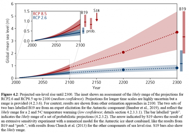 Nun ein Blick in den IPCC-Sonderreport selbst, also dem „the report showed“. Im für die Meerespegel „zuständigen“ Kapitel 4 steht zum Meeresspiegelanstieg: