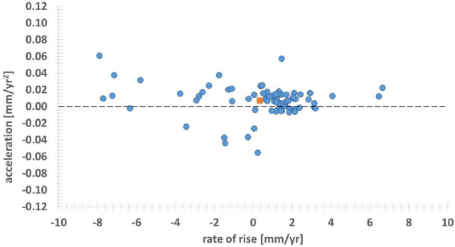 Bild 12 Figure 3. Acceleration and rate in the LTT tide gauges of the PSMSL database (www.psmsl.org) having a range not less than 100 years and no quality issues. Daten: www.sealevel.info.