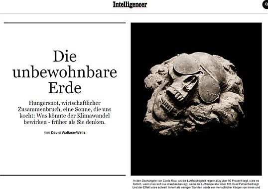 Im August des vergangenen Jahres veröffentlichte das New York Magazine einen Artikel, in dem behauptet wird, [siehe Aufmacherbild] wir werden ein Massensterben erleiden. …. weil die Erde innerhalb von 100 Jahren aufgrund verschiedener Folgen des Klimawandels, der Nahrungsmittelknappheit und der wirtschaftlichen und politischen Instabilität unbewohnbar sein wird.