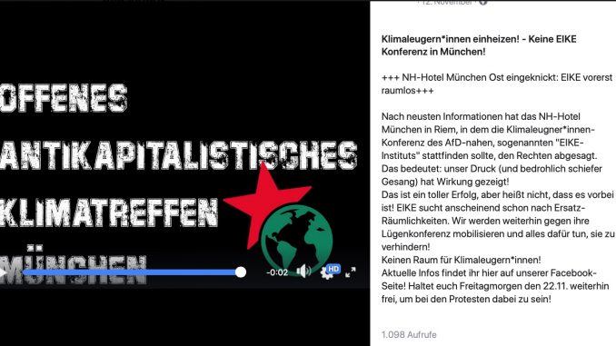 Wegen der aktuellen, vom Rechtsstaat nicht verfolgten Drohung der links-grünen Antifa,jede andere Meinung zum „Klimaschutz“ zu unterdrücken, wird der Ort öffentlich nicht bekannt gegeben. Denn auch wenn sie hier unter dem Decknamen „Antikapitalistisches Klimatreffen München“ auftritt, wissen alle, wer direkt oder indirekt dahintersteckt. Sie werden in ihrem Treiben auch nicht lockerlassen, weil sie unbegrenzte Ressourcen haben, aber sie werden trotzdem nicht siegen.