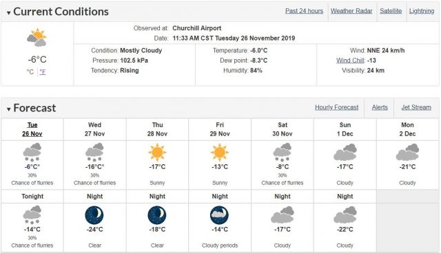 Das Wetter in Churchill war heute sehr kalt. Die leichte Mäßigung der Temperatur, vorhergesagt für den Rest dieser Woche, ist immer noch sehr förderlich für die Eisbildung: