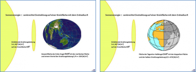 Die Erde erhält einen Anteil der solaren Abstrahlung auf einer Kreisfläche von (PI*R²) mit dem Erdradius R und der Solarkonstante 1.367 W/m². Der Fehler bei der konventionellen THE-Berechnung besteht nun darin, diese Solarkonstante über die Tag- und Nachtseite der Erde (@4*PI*R²) zu mitteln.
