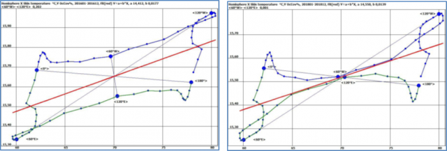 In Bild 8 bis 10 werden dort die Jahres-Mittel- Temperaturen für die Jahre 2016 bis 2018 in hemisphärischer Darstellung dargestellt. Die Temperaturdifferenz zwischen den Hemisphären T60W und T120E („Hysterese“) verringert sich während dieser Jahre beträchtlich von 0,202 auf 0,001 °C: