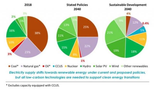 Der jährlichen Publikation der IEA zufolge ist eine grundlegende Verschiebung hin zu Low-Carbon-Quellen unvermeidlich. Sollte man der angekündigten Politik folgen, könnte sich der Anteil der Erneuerbaren-Erzeugung – nicht der Kapazität – fast verdoppeln. Kohle könnte schon im Jahre 2026 überholt werden. Zusammen könnte der Anteil von PV und Windrädern erzeugten Strom von 7% auf 24% steigen. Dies ist eine grundlegende Änderung im Vergleich zum Bericht des Vorjahres (WEO2018).