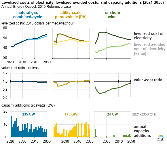 Im Referenzfall AEO2019 liegt das Wert-Kosten-Verhältnis des Erdgas-Kombikraftwerks während der gesamten Projektion am nächsten bei 1,0, was darauf hindeutet, dass sein Wert seine Kosten nur deckt. Den größten Anteil an neuen Kraftwerken haben Erdgas-Kombiblöcke (43% der Gesamtzahl der Kraftwerke von 2021 bis 2050). Das Wert-Kosten-Verhältnis der Solar-PV liegt etwas unter 1,0, was darauf hindeutet, dass ihr Wert im Durchschnitt ihre Kosten nicht deckt, aber die Kapazität noch hinzugefügt wird. In einigen Fällen mögen diese PV-Zusätze unwirtschaftlich sein, aber sie erfüllen immer noch die Anforderungen des Renewable Portfolio Standard (RPS) in 29 Staaten und dem District of Columbia.*