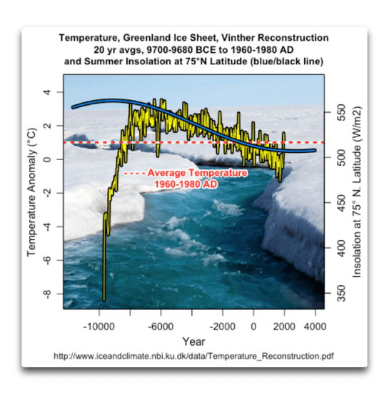 Hinsichtlich der Art und Weise, warum die Milankovitch-Zyklen auf eine Eiszeit hindeuteten, folgt hier eine Graphik des Temperaturverlaufs in Grönland und solarer Änderungen auf der Nordhemisphäre während der letzten 12.000 Jahre: