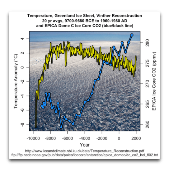 Das einzige, was hinsichtlich aller dieser Fragen klar hervortritt ist, dass die Antwort nicht „CO2“ lautet. Hier folgt noch ein Blick auf Grönland, diesmal mit dem CO2-Verlauf überlagert über den Temperaturverlauf: