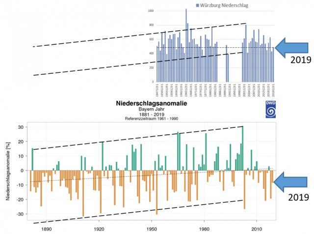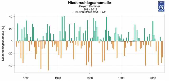 Jedenfalls sieht man deutlich, dass der Niederschlag in Bayern dank dem Klimawandel stetig zunimmt, wie beim Niederschlag üblich, jedoch mit extremen Variabilitäten. Das sehr trockene Jahr 2018 war in Bayern bei Weitem nicht das trockenste. Und der Sommerniederschlag ist gleichbleibend, von einer „Sommeraustrocknung“ keine Spur. Allerdings müssten die Sommer nach der gängigen Theorie: mehr Wärme = mehr Niederschlag, feuchter werden. Stattdessen haben alle Angst vor einem Austrocknen. Doch Logik war noch nie eine Domäne der GRÜNEN.