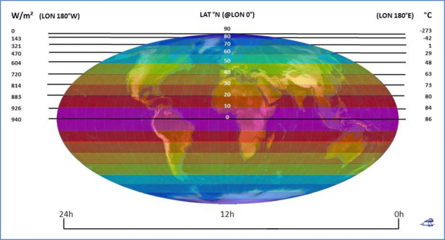 Aus dieser Abbildung wird sofort deutlich, dass die maximale temperaturwirksame spezifische Strahlungsleistung der Sonne im Tagesverlauf bei gleicher geographischer Breite immer denselben Maximalwert und damit auch immer dasselbe maximale örtliche S-B-Temperauräquivalent ergibt. Im Tagesverlauf wird also zwischen 75 Grad N und S (mit jeweils 243 W/m²) und dem Äquator (mit 940 W/m²) die global gemittelte temperaturwirksame spezifische „Mittelerde“-Strahlungsleistung von 235 W/m² (≅ -18°C) weit übertroffen. Damit ist bewiesen, dass die täglich durch Sonneneinstrahlung überall auf der Erde zwischen 75°N und 75°S erzeugten Temperaturen keinerlei zusätzlichen „natürlichen atmosphärischen Treibhauseffekt“ benötigen, um die gemessenen Ortstemperatur zu erklären.